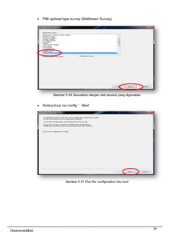 • Pilih aplikasi type survey (Multibeam Survey) Gambar 5.36 Sesuaikan dengan alat aquisisi yang digunakan • Selanjutnya run config Next Gambar 5.37 Run the configuration lalu next 29
