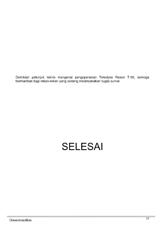 Demikian petunjuk teknis mengenai pengoperasian Teledyne Reson T-50, semoga bermanfaat bagi rekan-rekan yang sedang melaksanakan tugas survei. SELESAI 57