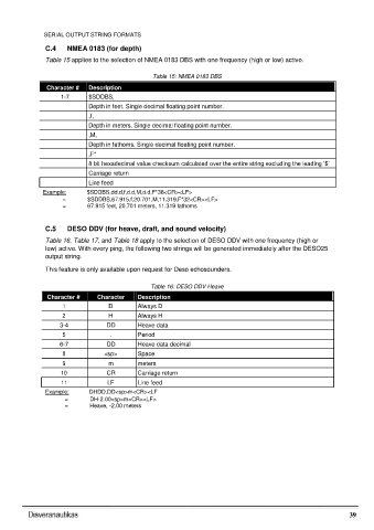 Table 15 applies to the selection of NMEA 0183 DBS with one frequency (high or low) active.