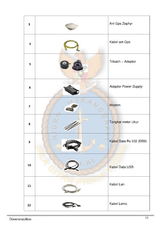 3 Ant Gps Zephyr Kabel ant Gps 4 Tribach + Adapter 5 6 Adaptor Power Supply Modem 7 Tongkat meter Ukur 8 9 Kabel Data Rs 232 (DB9) 10 Kabel Data USB Kabel Lan 11 Kabel Lemo 12 11