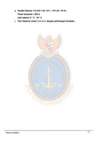 q. Kondisi Operasi: 115-230 V AC +5% / -10%,50 - 60 Hz, Power konsumsi < 800 w suhu operasi: 0 ° C - 40 ° C r. Fitur Opsional: modul Side Scan dengan perlindungan tranduser. 11