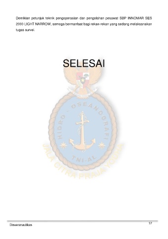 Demikian petunjuk teknik pengoperasian dan pengolahan pesawat SBP INNOMAR SES 2000 LIGHT NARROW, semoga bermanfaat bagi rekan-rekan yang sedang melaksanakan tugas survei. SELESAI 57